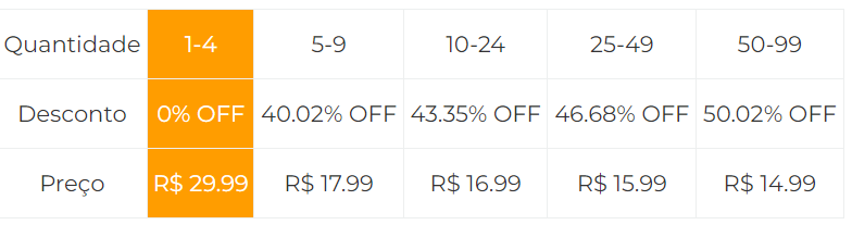 - De 50 a 99 unidades: 46,68% de desconto (R$ 15,99 por unidade)